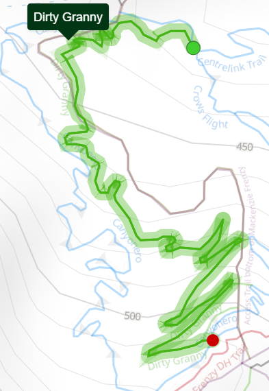 Granny links in with the end of Centrelink, and terminates at the Grassy Knoll. With 100m of elevation loss over the trails length, Granny is also a fun descent, and is a great trail to use to develop the skills required to ride Canyonero. Riders are reminded that etiquette dictates that descending riders give way to climbing riders; so it is best practice to descend Granny at a safe speed.